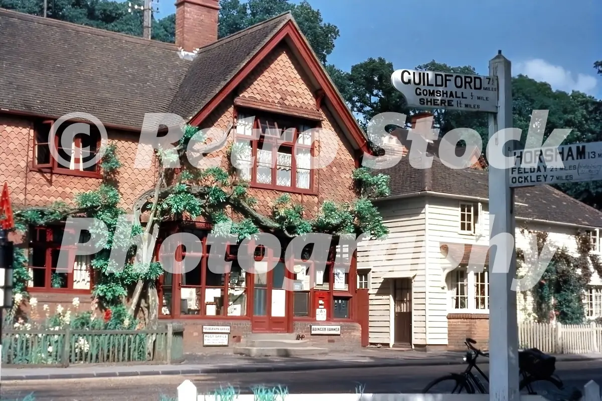 Abinger Hammer Post Office, Surrey, 1950s. Vintage colour photograph showing the village post office and surrounding buildings along the roadside, with traditional architecture, signposts to nearby towns, and everyday life in a rural English village during the post-war years.