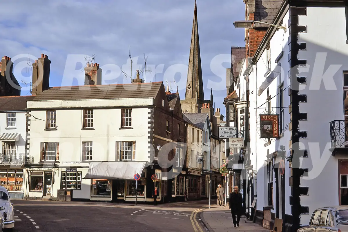 This authentic 1970s colour photograph, captured in 1972, documents the historic heart of Monmouth in Southeast Wales. The archival image features Agincourt Square, showing the Shire Hall with its iconic Bath stone facade and the statue of Henry V. To the right, the timber-framed Kings Head Hotel and the white-walled Punch House public house are prominent landmarks of the square. A second view looking down into the square shows the prominent spire of St Mary’s Priory Church rising above the local businesses, including the Popin-Jay and the offices of Coles, Knapp & Kennedy auctioneers. Pedestrians in typical 1970s attire are seen walking along the pavements of the old market town. This factual record preserves the Georgian and Victorian architectural heritage and the everyday urban atmosphere of Monmouth as it appeared in 1972.