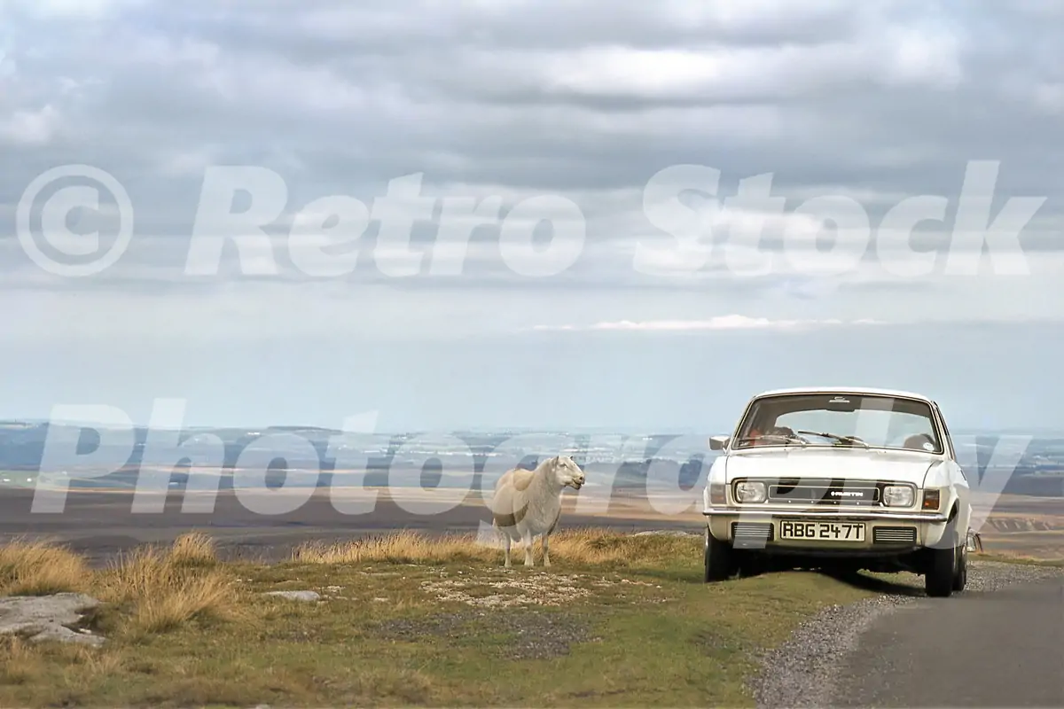 Austin Allegro and sheep, Tan Hill 1984