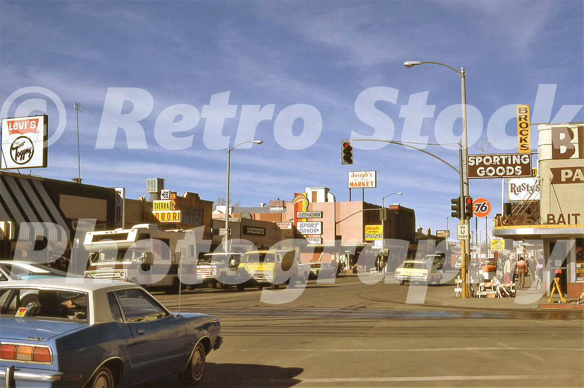 This authentic 1980s color photograph, captured in 1981, documents a bustling intersection on Main Street in Bishop, California. The archival image features a wealth of vintage commercial signage, including Levi’s The Toggery, Sierra Liquor, and Joseph’s Bi-Rite Market. On the opposite corner, signs for Brocks, Rusty’s, and a large Sporting Goods shop are visible alongside a Union 76 gas station globe. The street is populated with period-correct vehicles, including a blue Ford Mustang II in the immediate foreground, a white truck-bed camper, and a yellow van. Pedestrians are seen crossing near a construction area marked with wooden barricades. Bishop remains a primary thoroughfare for travelers in the Eastern Sierra and is still standing today as a major commercial center for Inyo County. While several of these specific local businesses have closed or changed names over the decades, the pink facade of the market and the general mountain-town layout remain recognizable. This factual record preserves the dense, mid-century signage and automotive landscape of the early eighties. All our images are available as royalty-free instant downloads for use in books, media, and creative projects – or make your own prints for home, work, or as a truly unique gift.