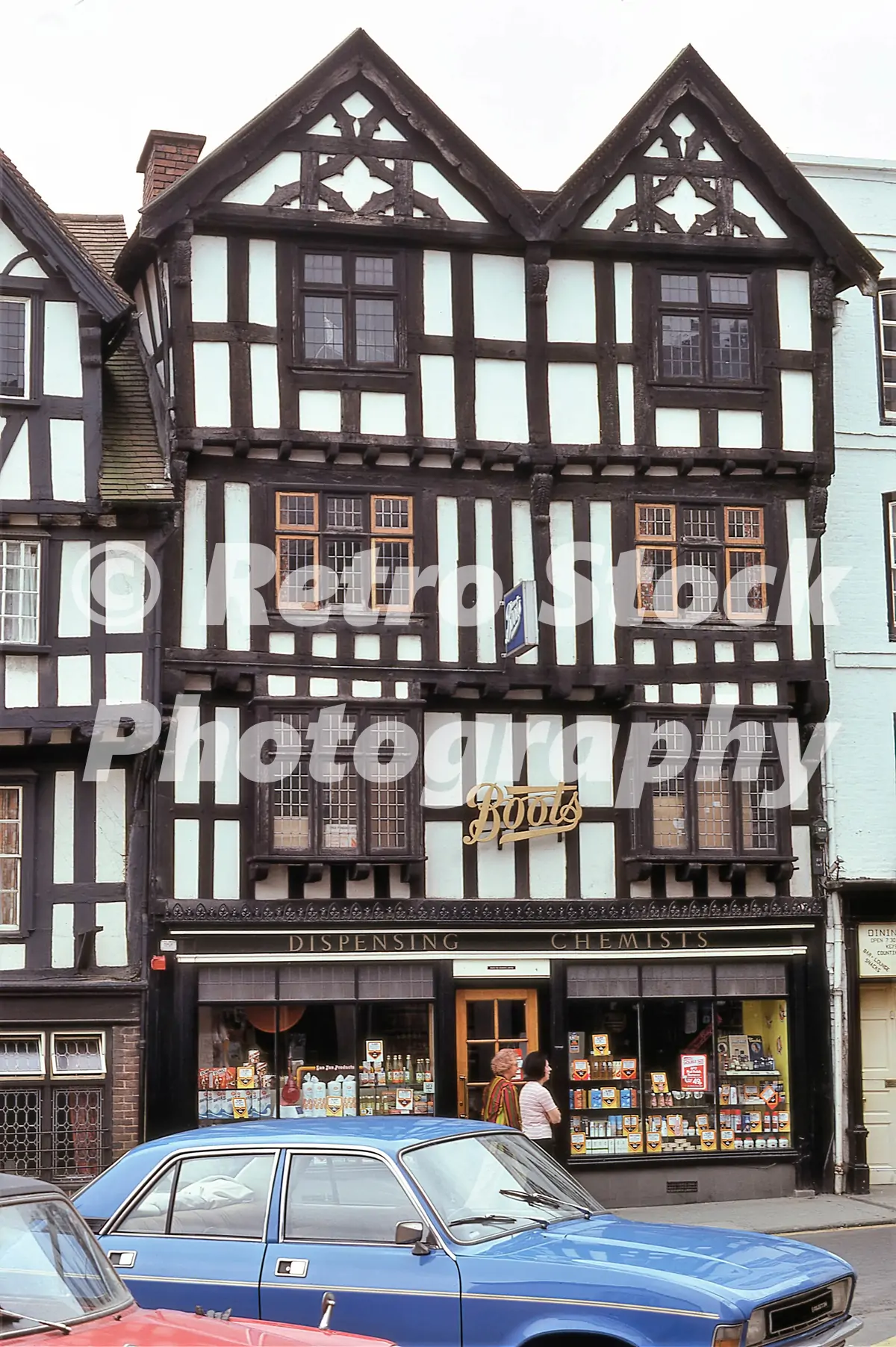 Boots The Chemist on King Street in Ludlow, Shropshire, seen in the 1970s, occupying a distinctive black-and-white timber-framed building Boots has since vacated and the building is now occupied by Oxfam, reflecting changing high-street use within Ludlow’s historic core.