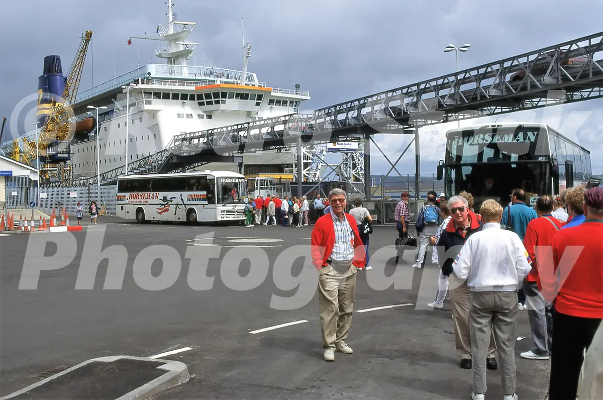 This authentic 1990s colour photograph captures the busy transport terminal at Fishguard Harbour, Pembrokeshire, Wales. The image provides a factual record of late twentieth-century travel, featuring a Horseman of Royal Berkshire coach company built on a Duple-bodied DAF SB chassis (registration H228TCP). The scene documents a group of passengers, many wearing vibrant red and blue windbreakers typical of 1990s outdoor fashion, waiting near the terminal infrastructure. In the background, a large Stena Sealink ferry is docked alongside a yellow dockside crane, with a metal gangway system spanning the quay. The overcast sky and industrial setting of the port reflect the functional nature of this major maritime link between Wales and Ireland. As a self-contained archival record, this shot is a valuable resource for transport enthusiasts and collectors of vintage Pembrokeshire and maritime photography.