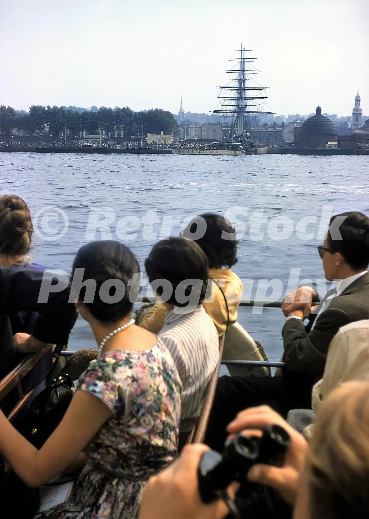 This authentic 1950s colour photograph offers a scenic river view of the historic tea clipper Cutty Sark at its permanent home in Greenwich. Taken in 1959, the image is captured from the perspective of passengers aboard a Thames river boat, with the ship’s masts and rigging rising prominently above the Greenwich waterfront. In the foreground, passengers in mid-century attire—including a woman in a floral print dress and a man with binoculars—look out toward the shore, capturing the essence of a 1950s day out in London. The background features the iconic domes of the Old Royal Naval College and the bustling activity of the riverbank. This archival print is a beautiful record of London’s maritime culture and mid-century tourism, making it an ideal resource for historical research, editorial use, or to print for yourself as a unique gift for those who love Greenwich and the Thames.