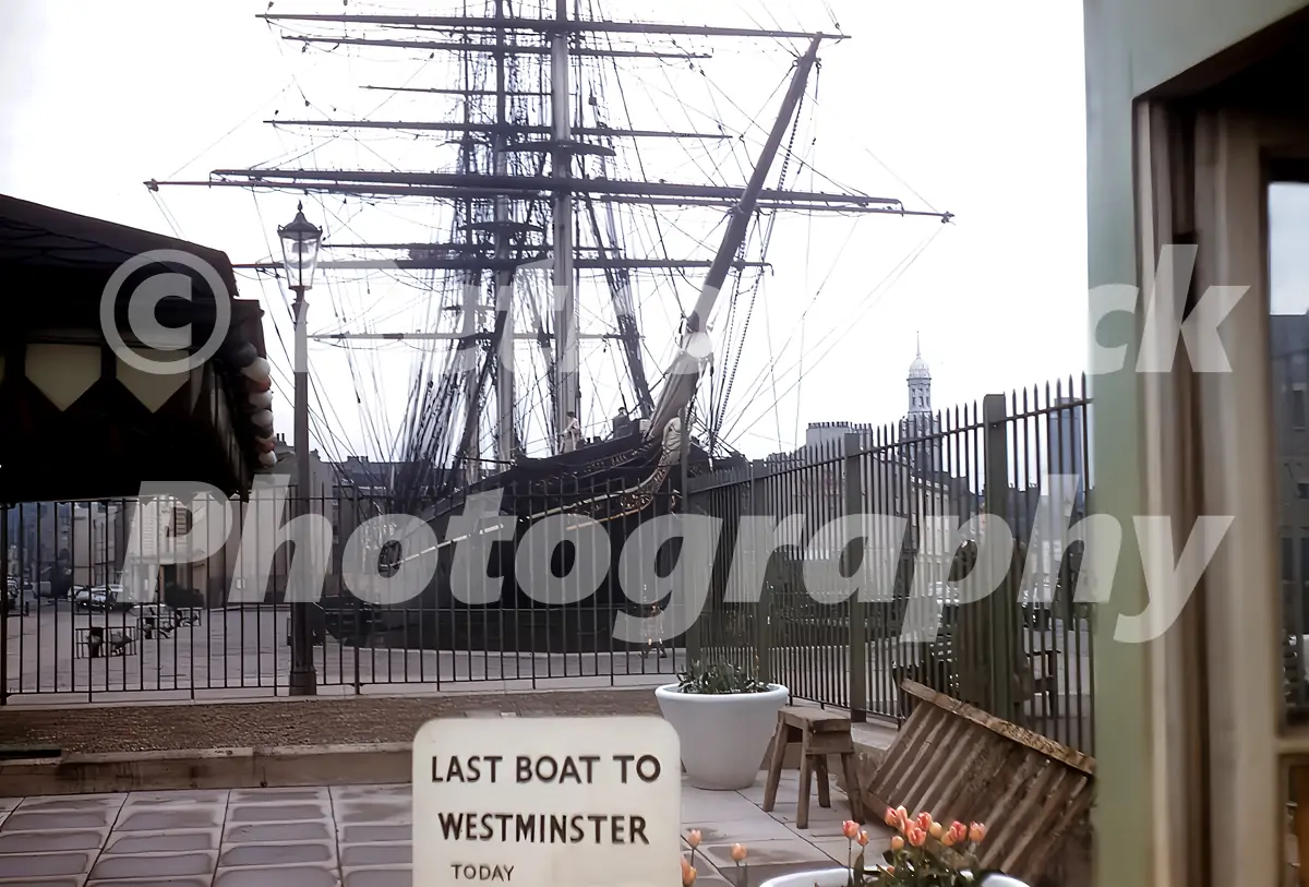 This authentic 1950s colour photograph captures the legendary tea clipper Cutty Sark shortly after it was opened to the public in Greenwich. Taken in 1959, the image shows the ship’s intricate rigging and majestic hull resting in its specially constructed dry dock. In the foreground, a white sign on a stone terrace informs visitors of the “LAST BOAT TO WESTMINSTER TODAY,” highlighting the vessel’s role as a major post-war tourist attraction along the Thames. The composition includes a view through metal railings towards the historic Greenwich waterfront, with a white planter and wooden stool adding a quiet, observational quality to the scene. This archival print is a meticulous record of London’s maritime heritage and serves as a significant document of the ship’s early years as a museum. It is an ideal resource for historical research, editorial use, or to print for yourself as a unique gift for those who admire classic sailing ships and the history of the Thames.