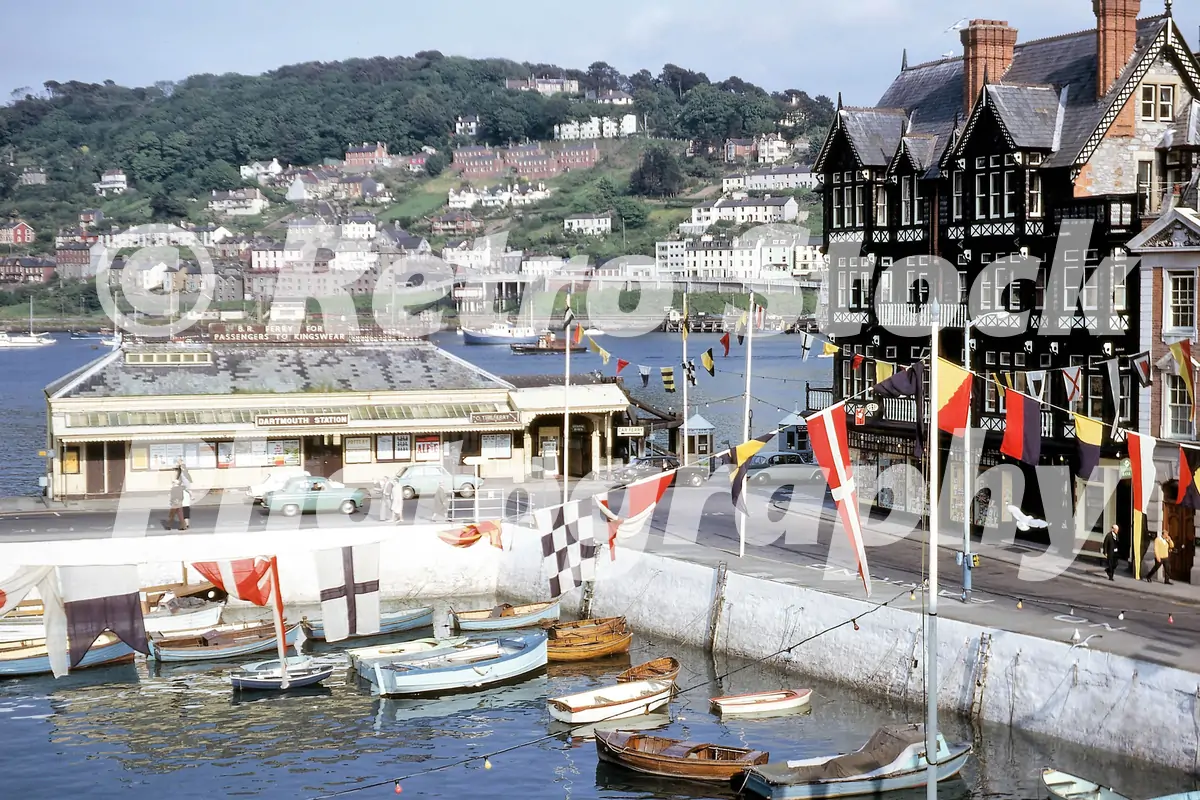 This 1967 view of Dartmouth harbour, Devon shows the British Rail ferry terminal to Kingswear on the left — often described as the only British Rail “station” that never had any trains, serving solely as the riverside link for the ferry across the Dart. Harbour bunting and signal flags decorate the waterfront, and small boats sit against the quay below. On the right, the black-and-white timbered Royal Castle Hotel anchors the scene, with Kingswear’s hillside houses rising across the estuary.