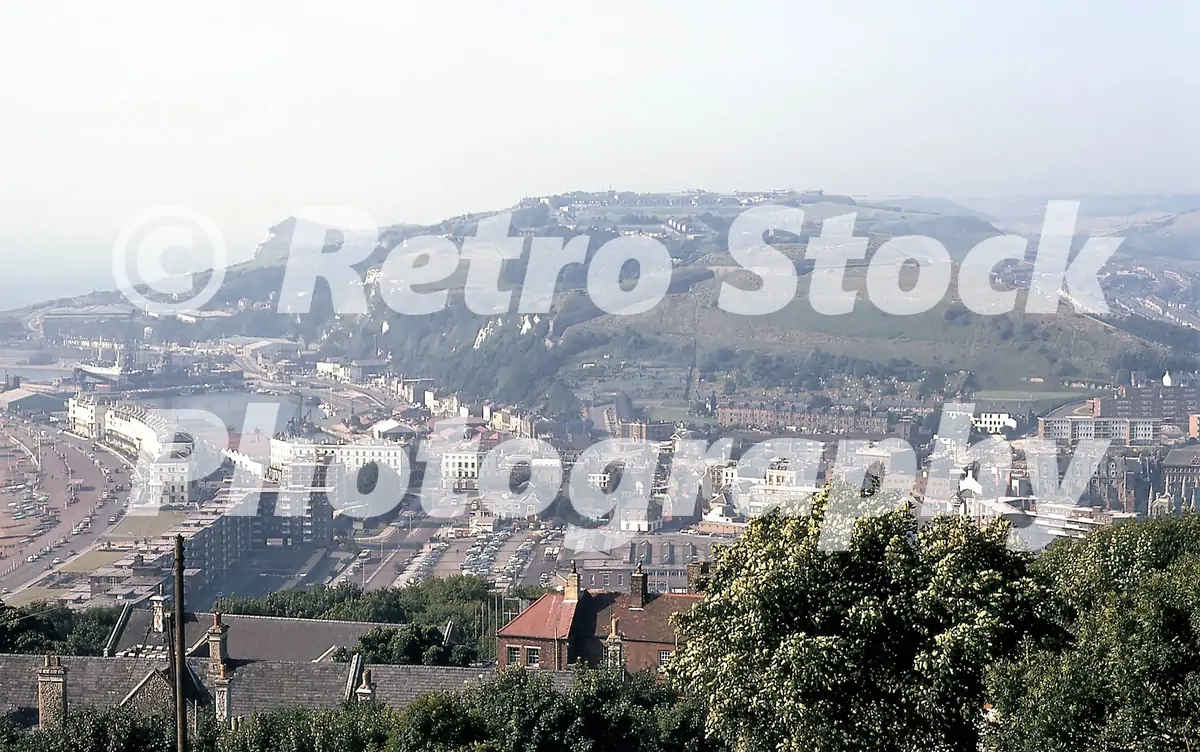 Aerial view of Dover, 1971 — looking towards the Western Heights — a high, panoramic view across the town’s western side, with dense housing, industrial areas and transport routes spread across the valley below. The elevated ridgeline of the Western Heights dominates the horizon, its military earthworks and open land contrasting with the tightly packed streets beneath. Taken before major late-20th-century road schemes and redevelopment, the image captures Dover’s urban form at a point when the town remained closely shaped by its historic geography and port-related growth.