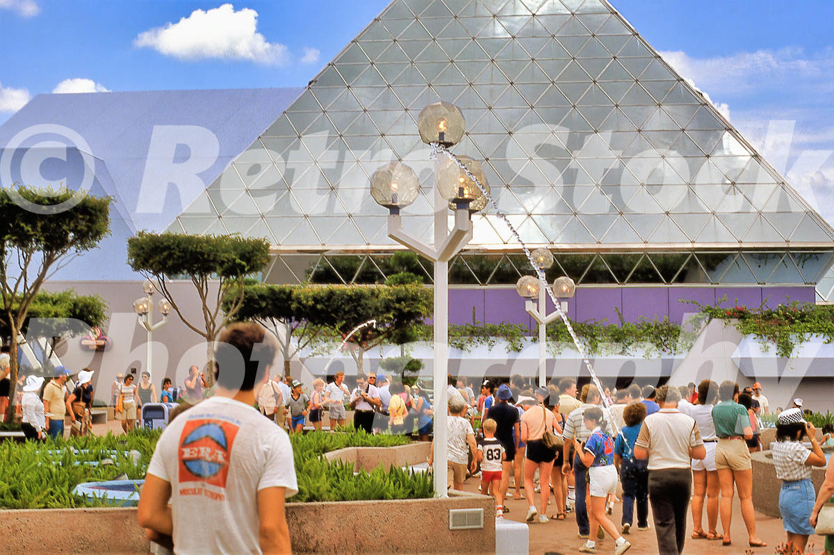 This authentic 1980s color photograph, captured in 1983, documents the striking architecture of the Journey Into Imagination pavilion at EPCOT Center (now EPCOT) in Walt Disney World, Florida. The archival image prominently features the pavilion’s iconic glass pyramids, which housed the original attraction featuring the Dreamfinder and Figment the dragon. In the foreground, the unique Leap Frog Fountains are active, with streams of water jumping between tiered concrete planters and geometric glass sculptures. Crowds of guests in vintage summer fashion, including high-waisted shorts and graphic t-shirts, populate the plaza, with some stopping to interact with the kinetic water displays. Opened in early 1983, the pavilion was a flagship of Future World, celebrating the power of human creativity. While EPCOT is still standing and remains a major global destination, the interior of the pavilion has seen several major overhauls, and the surrounding area has been reimagined as part of the World Celebration neighborhood. This factual record preserves the pristine, futuristic aesthetic of the pavilion during its first full year of operation. All our images are available as royalty-free instant downloads for use in books, media, and creative projects – or make your own prints for home, work, or as a truly unique gift.