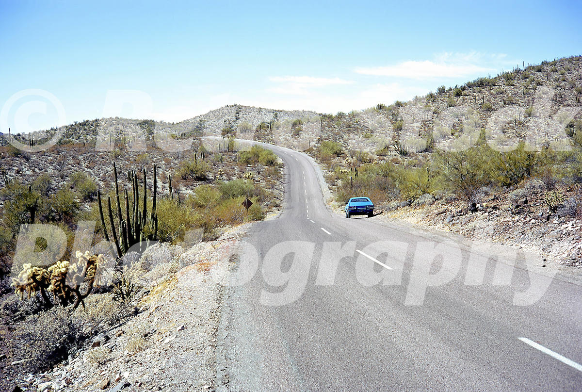A Ford Pinto parked along a winding desert road at Organ Pipe Cactus National Monument, photographed in 1972. Saguaro and organ pipe cacti line the roadside, with low desert hills stretching into the distance, capturing the scale and isolation of southern Arizona landscapes and the experience of long-distance driving in the early 1970s.