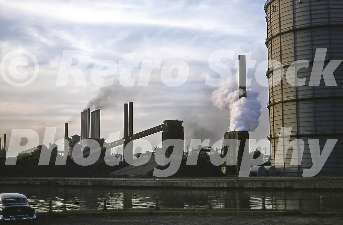 This authentic 1950s color photograph captures the sheer scale and industrial intensity of the Ford Rouge Factory in Dearborn, Michigan, in 1954. The image showcases the sprawling complex’s numerous smokestacks, with thick plumes of white and grey smoke billowing into the overcast sky, illustrating the around-the-clock production of the era. Large coal conveyors and massive storage tanks line the waterfront, while the dark silhouette of the factory’s infrastructure is reflected in the calm waters of the turning basin in the foreground. In the lower left corner, a vintage black sedan is partially visible, providing a stark contrast to the massive industrial backdrop. Once the largest integrated factory in the world, the Rouge remains an enduring symbol of Detroit’s manufacturing heritage. This high-resolution scan provides a gritty, realistic look at the environmental and architectural footprint of mid-century American industry. This digital download is an incredible piece of local history, perfect to print for yourself as vintage Michigan wall art.