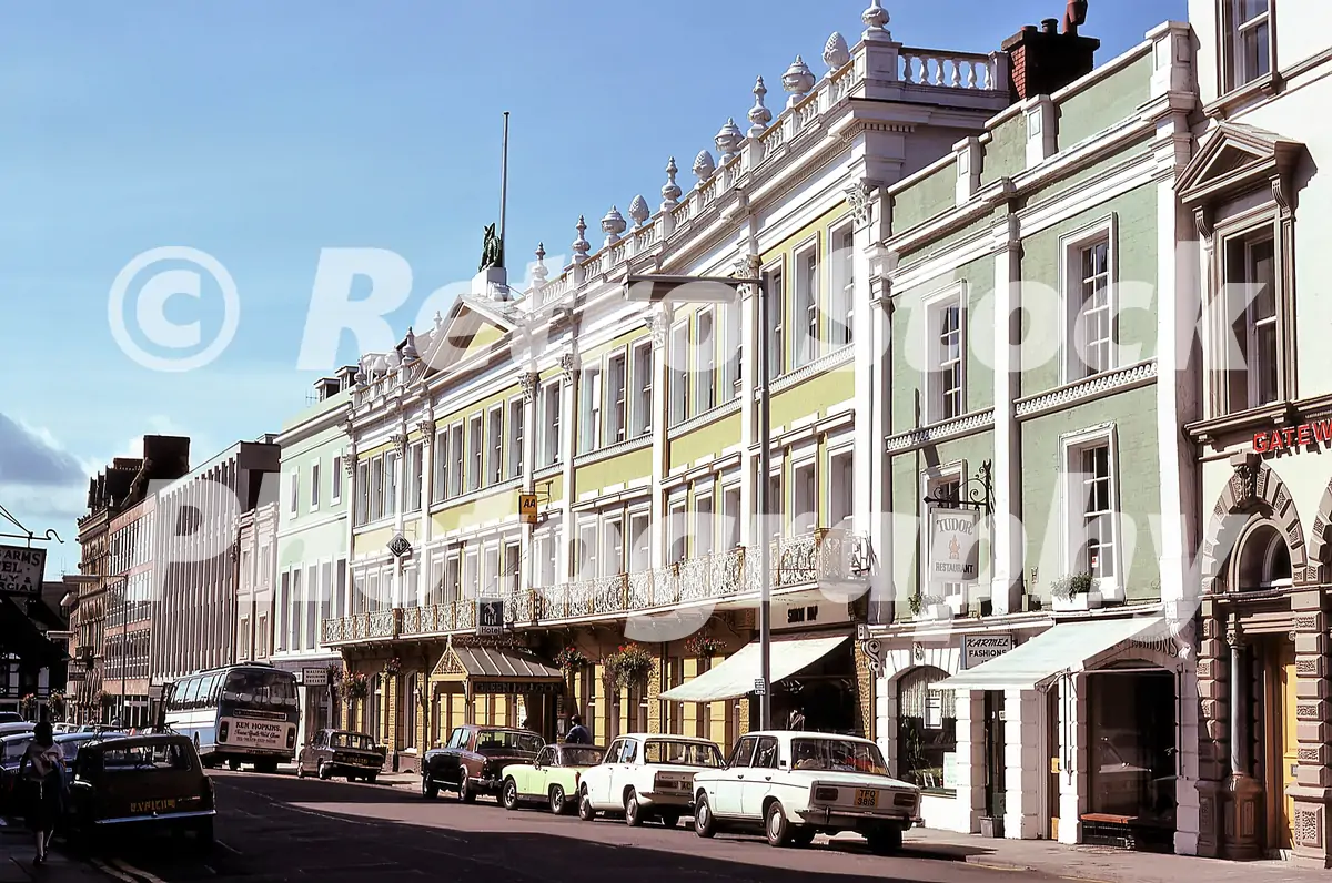 The Green Dragon Hotel on Broad Street, Hereford, photographed in the late 1970s, showing its long classical frontage with balconies, awnings, and ornate roofline detailing. Parked saloon cars line the street outside the hotel, while neighbouring Georgian and Victorian buildings form a continuous town-centre streetscape. The scene reflects Hereford’s historic commercial core during a period of steady traffic and traditional high street use.