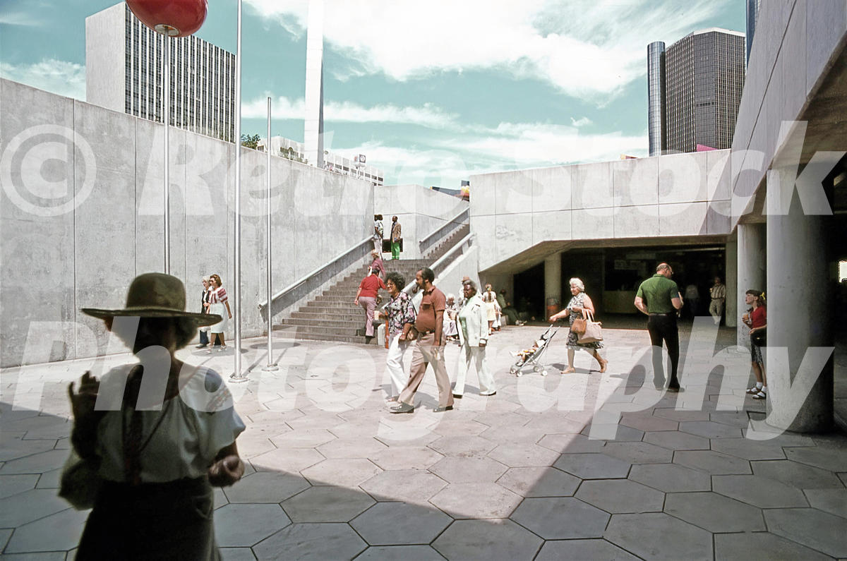 This authentic 1980s color photograph captures a lively day at Hart Plaza, Detroit’s premier riverfront civic space, in 1980. The image showcases the plaza’s distinctive modernist architecture, featuring light gray concrete walls and a large upper terrace paved with hexagonal stone tiles. Diverse groups of pedestrians, dressed in typical late-seventies and early-eighties fashions, move across the sun-drenched plaza and up the wide concrete staircases. In the background, the Pylon monument and the glass towers of the Renaissance Center punctuate the skyline, signifying the city’s modern redevelopment. Designed by Isamu Noguchi and Shoji Sadao, Hart Plaza had only recently been completed at the time of this photo, serving as a hub for festivals and public gatherings. This high-resolution scan provides a detailed look at the social and architectural landscape of Detroit’s waterfront during the eighties. This digital download is an incredible piece of local history, perfect to print for yourself as vintage Michigan wall art.