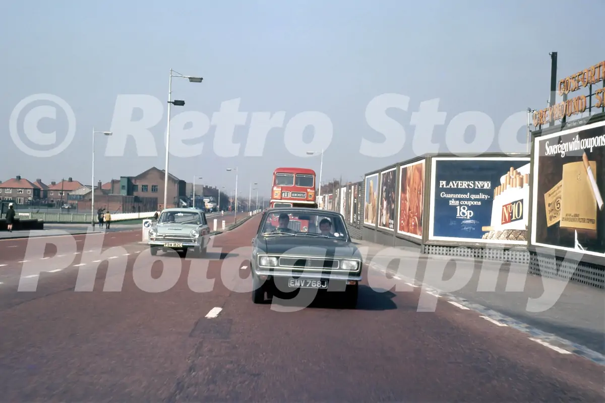 Hillman Hunter, Gosforth, Newcastle 1971. The greyhound track on the right is now Asda