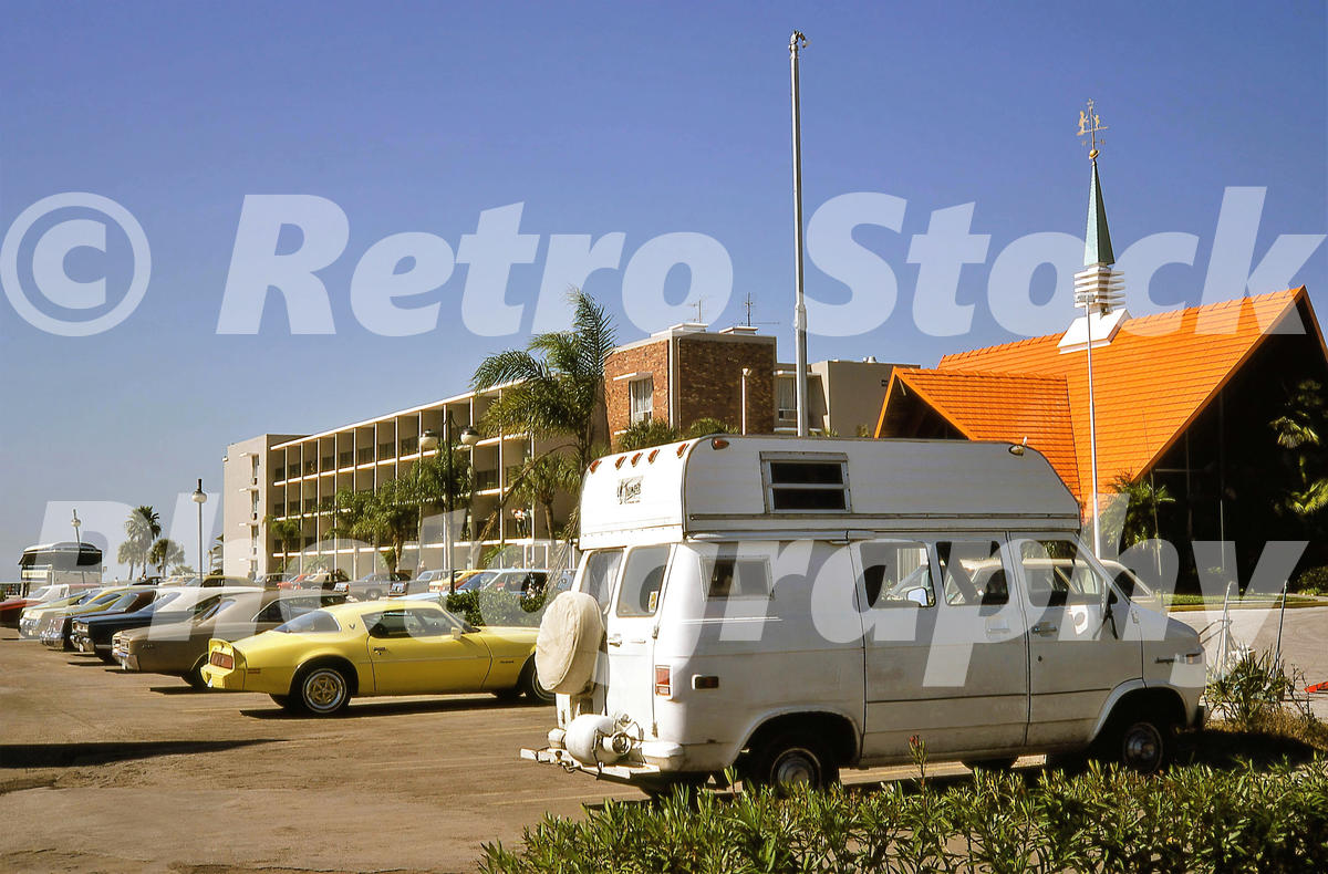This authentic 1980s color photograph, captured in 1980, documents the Howard Johnson’s Motor Lodge and Restaurant located in St. Petersburg, Florida. The archival image features the brand’s unmistakable mid-century architecture, highlighted by the bright orange porcelain-tiled roof and the signature turquoise A-frame spire topped with a Simple Simon and the Pieman weather vane. In the foreground, the parking lot showcases early 1980s travel culture with a white Chevrolet Chevy Van camper conversion and a bright yellow second-generation Chevrolet Camaro. A multi-story guest wing with balcony access stands in the background under a clear, pale blue sky. For decades, Howard Johnson’s was a staple of the Florida roadside, known for its predictable hospitality and 28 flavors of ice cream. While most original Howard Johnson’s locations have since been demolished or rebranded, this site remains a significant piece of American commercial history. All our images are available as royalty-free instant downloads for use in books, media, and creative projects – or make your own prints for home, work, or as a truly unique gift.