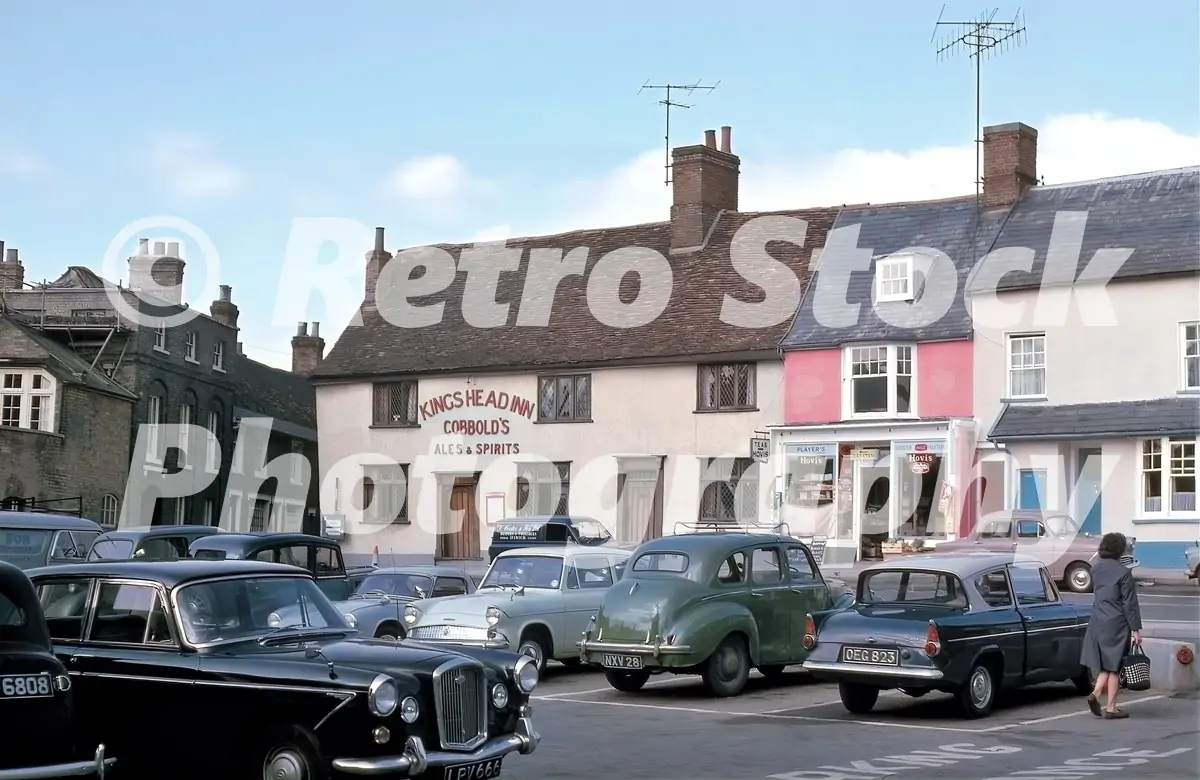 Kings Head Inn, Woodbridge, Suffolk, 1965 — Market Hill town square framed by the Kings Head Inn and neighbouring shopfronts, with a forecourt of everyday cars: a couple of Ford Anglias, an Austin A40 Devon and a Wolseley 6/99 among them. A calm moment in mid-sixties Woodbridge.