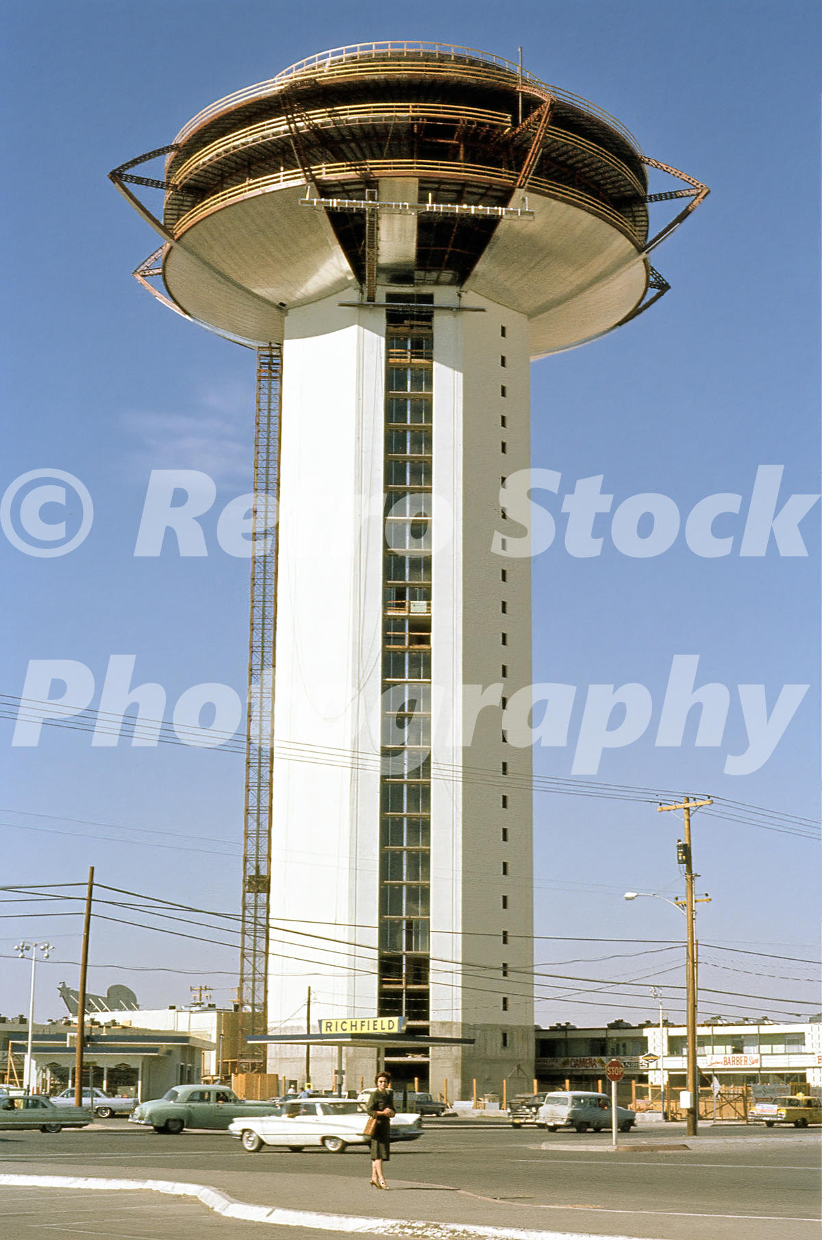 This authentic 1960s colour photograph captures the ambitious construction of the Landmark Hotel and Casino in Las Vegas, Nevada, in 1962. The image features the iconic white concrete pedestal tower rising into a clear blue sky, topped with its distinctive, mid-century modern “flying saucer” observation and restaurant levels still encased in steel scaffolding. In the foreground, a woman in a dark period dress walks across a car park, while several vintage automobiles from the late 1950s and early 1960s—including a white sedan and a mint-green coupe—are parked near a Richfield petrol station. The scene provides a rare look at the Googie-style architectural development of the Las Vegas Strip before the hotel’s eventual opening later in the decade. This digital download is an extraordinary historical record of Nevada’s mid-century skyline and urban evolution, perfect to print for yourself as a piece of vintage Americana wall art.