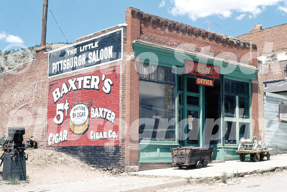 The Little Pittsburgh Saloon photographed in 1973, with its painted brick advertising for Baxter’s cigars still prominent on the side wall. Once a busy mining town, Victor’s streets retained many late-19th-century storefronts into the 1970s, and scenes like this reflect the quiet afterlife of Colorado’s gold-rush communities as tourism and heritage replaced industry.