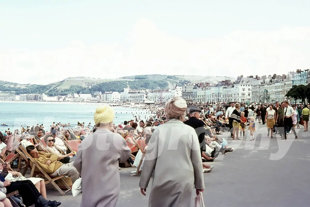 This authentic 1960s colour photograph documents the bustling summer season on the promenade in Llandudno, Caernarfonshire, Wales. The image provides a factual record of the town’s iconic seafront, documenting a high density of holidaymakers enjoying the coastal air. In the foreground, numerous visitors are captured relaxing in traditional wooden deckchairs, while others stroll along the wide walkway in typical 1960s attire, ranging from summer dresses to formal overcoats and hats. The background features the famous sweeping crescent of Victorian and Edwardian hotels that line the bay, stretching toward the foot of the Little Orme. The calm waters of the Irish Sea are visible on the left, with bathers seen on the distant shoreline. This shot serves as an essential resource for social historians and collectors of vintage Welsh tourism and mid-century British lifestyle photography.