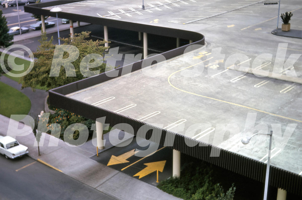 This authentic 1960s color photograph, captured in 1963, provides an elevated bird’s-eye view of the innovative parking infrastructure at Lloyd Center in Portland, Oregon. Taken from the vantage point of the adjacent Sheraton Hotel, the archival image highlights the mall’s massive integrated parking deck, characterized by clean mid-century lines, dark vertical-slat railings, and slender white support columns. Large yellow directional arrows painted on the asphalt guide traffic into the subterranean levels, while the upper deck shows clearly marked, angled parking stalls. The perimeter is accented by manicured green lawns, small trees, and a white vintage sedan parked along the street. When it opened in 1960, the Lloyd Center was a marvel of urban planning, specifically designed to accommodate the growing automobile culture with thousands of easily accessible parking spaces. While the mall underwent a major renovation in the early 1990s to become a fully enclosed facility, much of this original concrete structural framework remains in use today. This factual record preserves the scale and “Space Age” efficiency of what was once the largest shopping center in the world. All our images are available as royalty-free instant downloads for use in books, media, and creative projects – or make your own prints for home, work, or as a truly unique gift.