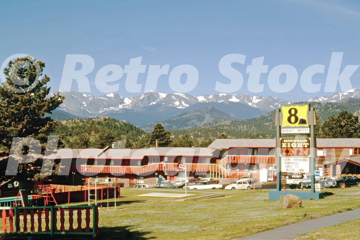 This sunny roadside scene captures the Mountain Eight Inn during the summer of 1984, set against the dramatic backdrop of Rocky Mountain National Park. Economy motels like this—simple, clean, and auto-friendly—boomed across America in the decades after World War II as families embraced road trips, national parks, and the freedom of the open highway.