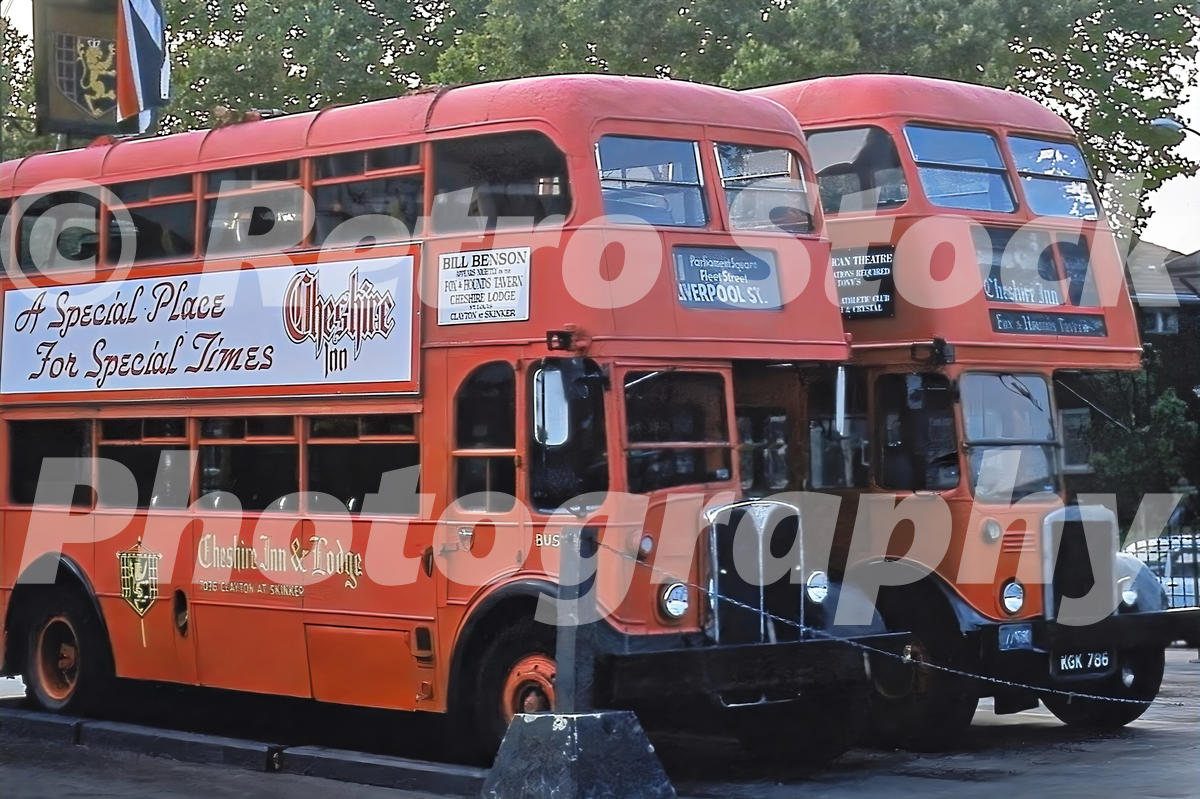 A pair of classic London double-decker buses—once a familiar sight on the streets of the UK capital—now sit parked outside the Cheshire Inn & Lodge in St. Louis, Missouri, their bright red paintwork standing out proudly against the leafy backdrop. These imported buses were often used during the 1960s and 1970s as quirky promotional vehicles after being retired from regular service in London. The front coach, carrying the plate KGX 766, is a traditional AEC Regent III RT-type, a model built in large numbers for London Transport from the late 1940s through the mid-1950s.