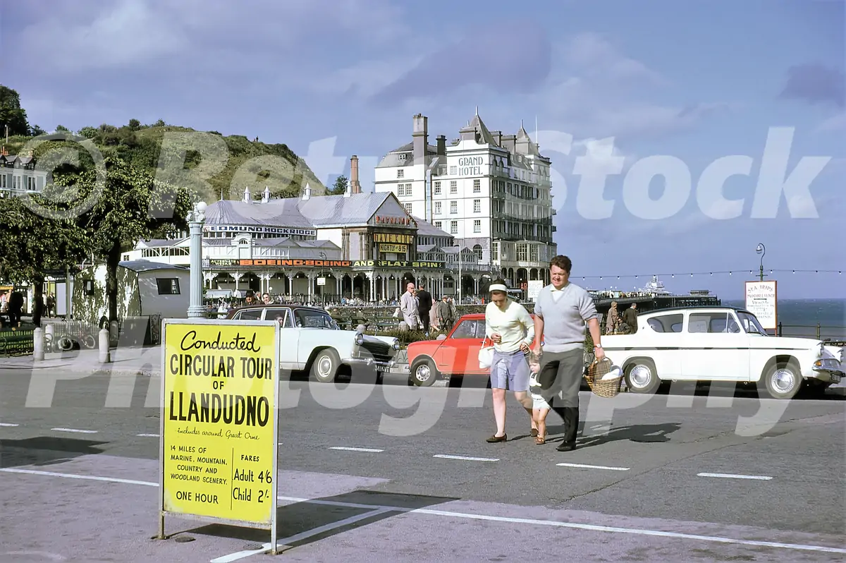 This authentic 1960s colour photograph documents the bustling tourist area near the pier in Llandudno, Caernarfonshire, Wales, in 1967. The image provides a factual record of the town’s entertainment district, featuring the Pier Pavilion Theatre in the background with large advertising banners for summer season stars Edmund Hockridge and Dave King. The Victorian Grand Hotel stands prominently behind the theatre, documenting the classic seaside architectural skyline. In the foreground, a large yellow sign advertises a “Conducted Circular Tour of Llandudno” around the Great Orme for the fare of 4/6 for adults. The street scene captures holidaymakers in typical mid-1960s attire, including a family walking past a line of period cars that includes a red Mini, and a white Ford Anglia. The bright sunlight and clear conditions illustrate the peak summer season in this premier North Wales resort. As a self-contained archival record, this shot serves as an essential resource for social historians and collectors of vintage Welsh tourism and theatrical history photography.