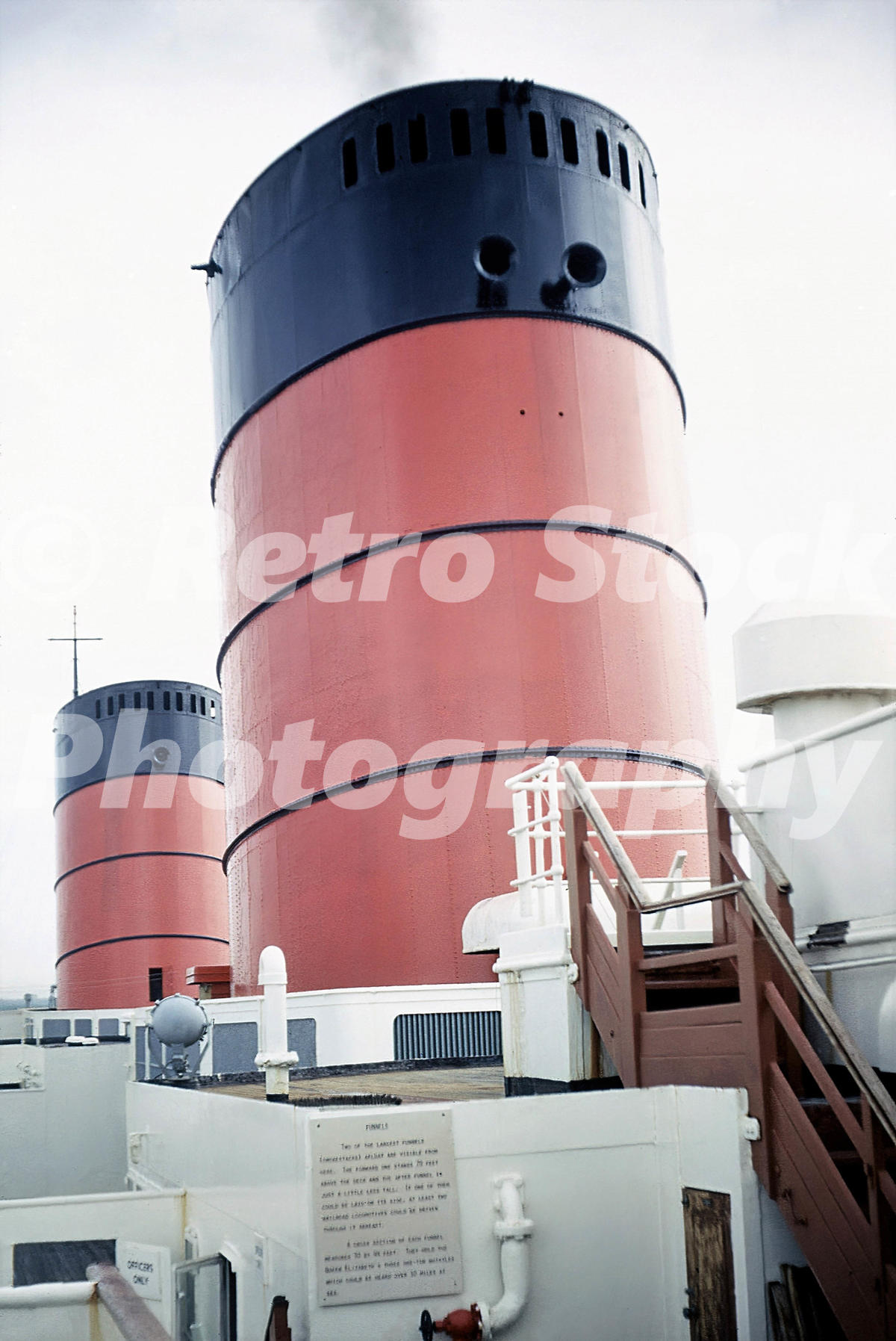 This authentic 1960s colour photograph, captured in 1969, documents the towering funnels of the RMS Queen Elizabeth during her final years at Port Everglades in Fort Lauderdale, Florida. The archival image highlights the iconic Cunard Line livery—bright red with black bands—and features a white deckhouse in the foreground equipped with a traditional wooden staircase. A prominent informational plaque is visible on the bulkhead, providing passengers and tourists with technical facts about the ship’s massive funnels. Following her retirement from transatlantic service in 1968, the legendary liner served as a static tourist attraction and hotel in Florida before being sold to C.Y. Tung and moved to Hong Kong. While the ship was tragically lost to fire in 1972, this factual record preserves the scale and grandeur of the “Queen” during her brief residency as a Florida landmark. Today, the site at Port Everglades continues to serve as a world-class cruise hub, though the era of the classic superliner has transitioned into the age of modern mega-ships. All our images are available as royalty-free instant downloads for use in books, media, and creative projects – or make your own prints for home, work, or as a truly unique gift.