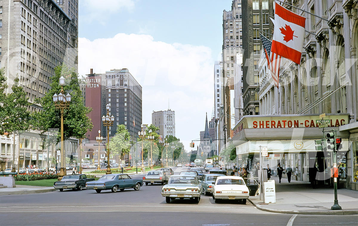 This authentic 1960s color photograph captures the bustling atmosphere of Washington Boulevard at the intersection of Michigan Avenue in Detroit, Michigan, in 1966. The focal point is the grand Sheraton-Cadillac Hotel, adorned with large American and Canadian flags and a prominent marquee. The street is active with mid-century automobiles, including various sedans in shades of blue, white, and silver, while pedestrians in period-appropriate attire walk along the wide sidewalks. In the background, other historic landmarks like the Statler Hilton are visible, alongside Detroit’s characteristic ornate streetlights and lush boulevard greenery. This hotel faced a period of decline and closure in the late 20th century but was meticulously restored and reopened in 2008 as the Westin Book Cadillac. This high-resolution scan offers a vivid look at the city’s premier hotel district during the mid-sixties. All our images are available as royalty-free instant downloads for use in books, media, and creative projects – or make your own prints for home, work, or as a truly unique gift.
