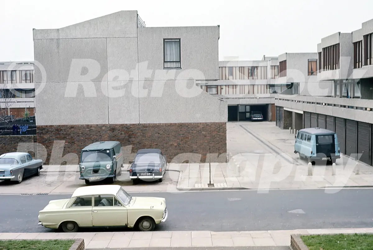 A 1975 look across the modernist concrete landscape of Thamesmead, one of London’s most ambitious post-war housing schemes. The stark geometry and elevated walkways had only recently been completed when this photograph was taken, part of the early phases built by the Greater London Council in the late 1960s and early ’70s. On the street below is a line-up of very typical mid-’70s vehicles: a Hillman Minx, a Mk1 Ford Cortina, a Morris J4 van, a Ford Consul, a Bedford J2 van and, in the distance, a Triumph 2000. A snapshot of everyday East London motoring against the backdrop of one of Britain’s most famous — and most filmed — housing estates.