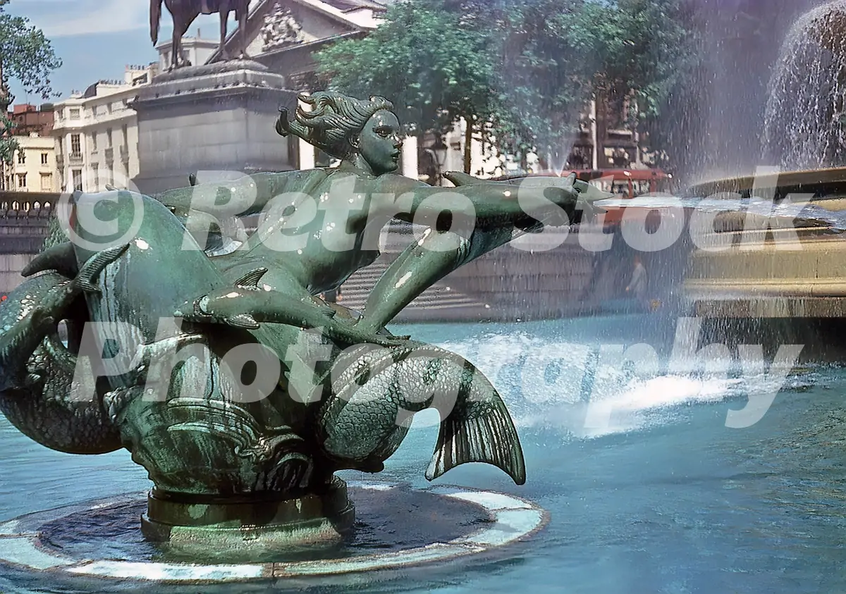 This authentic 1950s colour photograph provides a detailed view of one of the bronze sculptures designed by Sir Charles Wheeler for the Trafalgar Square fountains. Installed in 1948 as part of the memorial to Admirals Jellicoe and Beatty, the sculpture depicts a mermaid with a fish-like tail wrestling with a dolphin. The vibrant blue water of the fountain basin provides a sharp contrast to the green patina of the bronze. In the background, the stone base of an equestrian statue and a passing red double-decker bus can be seen through the misty spray of the water. This archival print is a beautiful record of mid-century London’s public art and serves as an excellent resource for researchers, editorial use, or to print for yourself as a unique piece of vintage wall art.