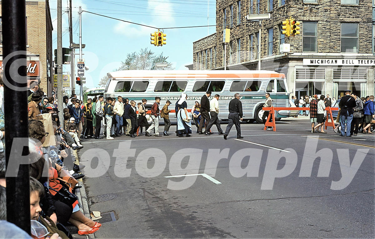 This authentic 1960s colour photograph, captured in 1967, depicts a bustling street scene during the Tulip Time Festival at the intersection of W 8th St and River Ave in Holland, Michigan. The archival image features a silver and orange coach from the Indiana Motor Bus Company navigating through a crowd of festival spectators and pedestrians. In the background, the rustic stone facade of the Michigan Bell Telephone building (located at 13 West 8th Street) is clearly visible, along with a glimpse of the Woolworth’s storefront to the left. Road signs for US-31 and I-196 are mounted on a nearby utility pole, alongside a vintage three-tier yellow traffic signal. Spectators, including several women in traditional Dutch costume with white lace caps, line the sidewalks behind orange wooden barricades. While the Michigan Bell building still stands as a historic anchor of the downtown district, many of the surrounding retail businesses have changed ownership over the decades. This factual record captures the mid-century intersection of transportation, local commerce, and cultural celebration in Western Michigan. All our images are available as royalty-free instant downloads for use in books, media, and creative projects – or make your own prints for home, work, or as a truly unique gift.