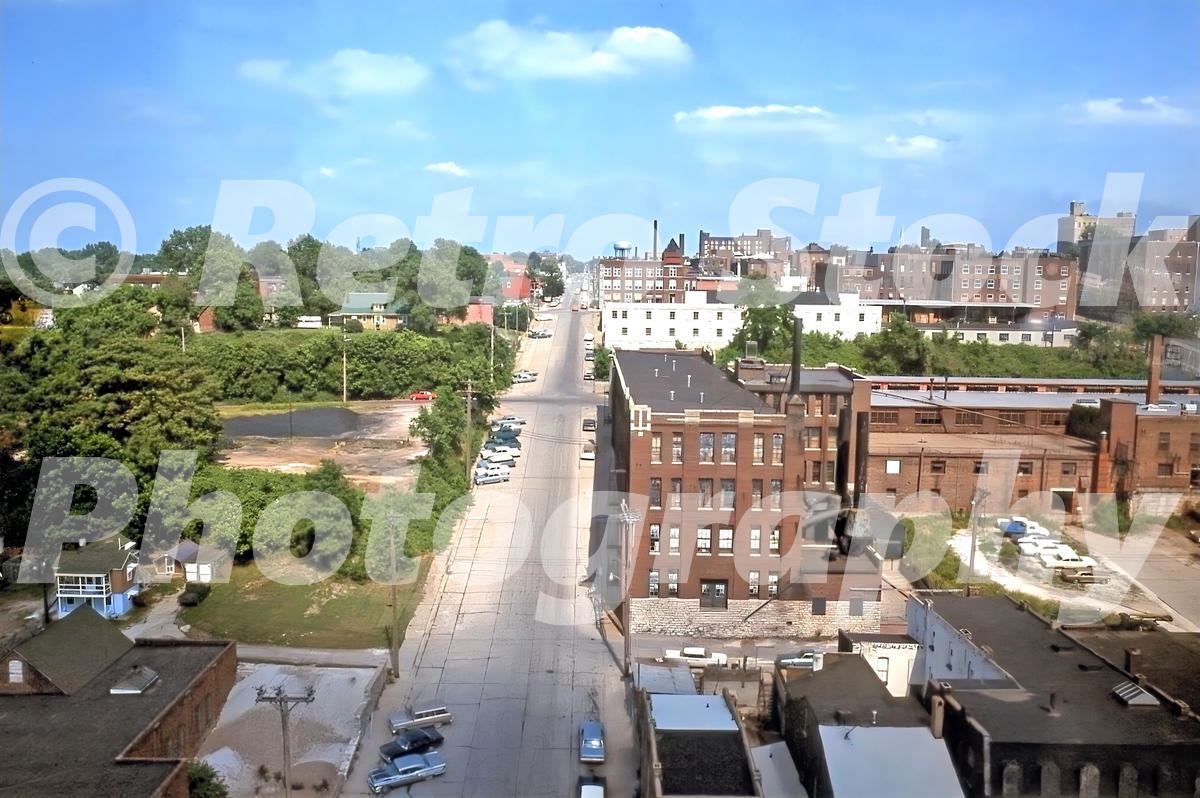 Viewed from the Sky Cruise chairlift in 1969, looking down over the town. The aerial ride linked the city to Quinsippi Island, a large-scale 1960s tourism and redevelopment project created on former railroad marshland along the Mississippi River. Promoted as a regional destination, the island combined amusement rides, a miniature railway, museums, and landscaped riverfront attractions, reflecting the mid-century belief that leisure developments could revive struggling downtowns and draw passing highway traffic into the city.